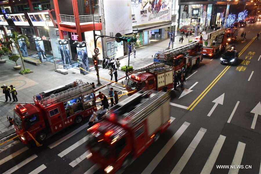 Rescuers work at the site of a cinema fire in Taipei, southeast China, March 29, 2017. A cinema fire in downtown Taipei Wednesday night has forced the evacuation of nearly 1,000 people, the city's fire department said. The fire has been put out. No casualties were reported. (Xinhua/Ou Dongqu)