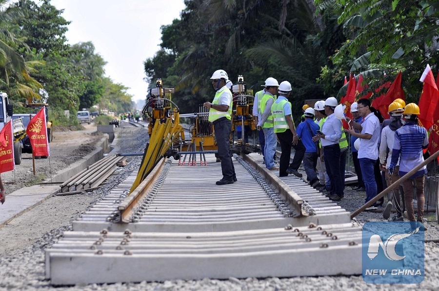 Photo taken on Jan. 12, 2018 shows the track-laying ceremony of Matara-Kataragama railway extension project held in Matara, southern Sri Lanka. (Xinhua/Pradeep Pathirana)