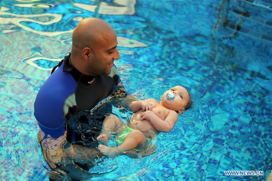 An infant swims with a trainer in Cairo, Egypt on Jan. 16, 2018. At a small closed and ceiled hygienic swimming pool in a language school on the outskirts of Cairo, a dozen of parents took their babies to attend the special swimming classes in the unique center run by international baby swimming coach Mohamed Abdel-Maksoud. (Xinhua/Ahmed Gomaa)