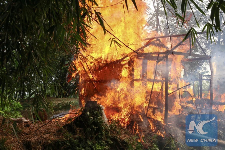 File photo taken on Sept. 7, 2017 shows a house burning in Gawdu Tharya village near Maungdaw in Rakhine state in northern Myanmar. (Xinhua/AFP)