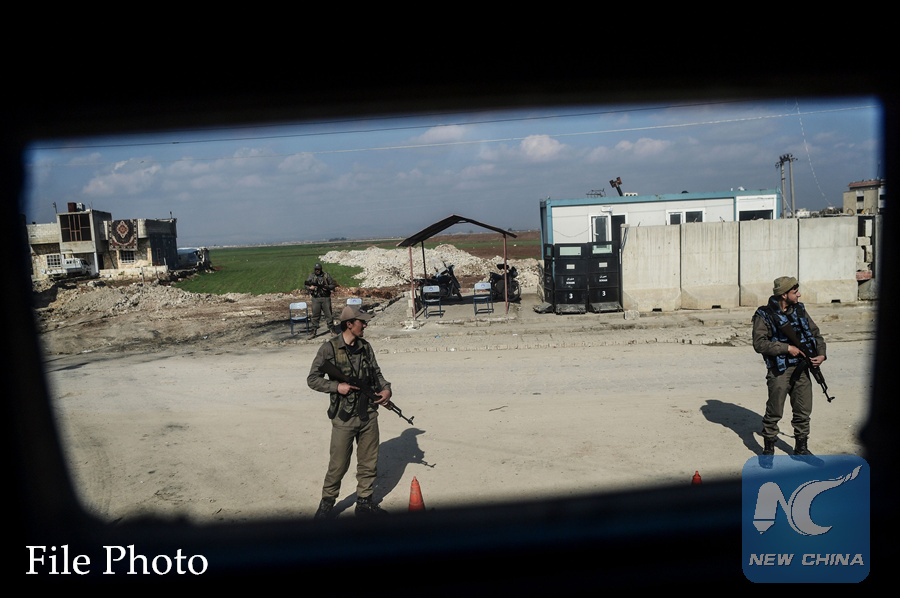 Turkish-backed Syrian rebel fighters stand guard at a checkpoint in the Syrian town of Azaz on a road leading to Afrin, on February 1, 2018. (AFP PHOTO)