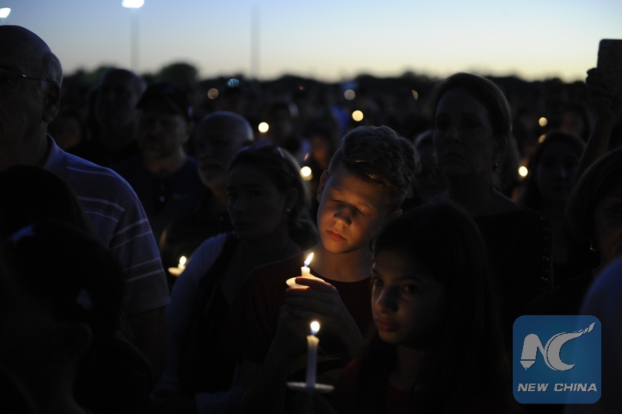 People hold candles during a vigil for the victims of the shooting at Marjory Stoneman Douglas High School, in Parkland, Florida, the United States, Feb. 15, 2018. (Xinhua/Liu Yang)