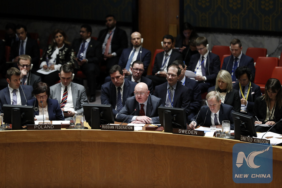 Russian Ambassador to the United Nations Vassily Nebenzia (C, Front) addresses a United Nations Security Council meeting on the situation in Syria at the UN headquarters in New York, on Feb. 22, 2018. (Xinhua/Li Muzi)