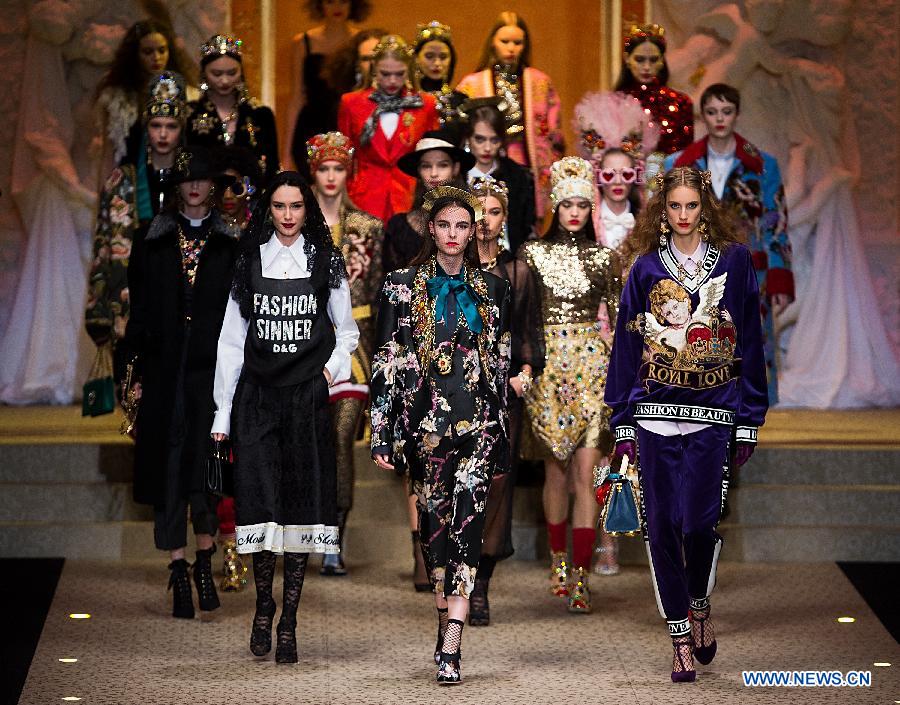 Models present creations of Dolce&Gabbana "Fashion Devotion" Autumn/Winter 18/19 women's collection during Milan Fashion Week in Milan, Italy, Feb. 25, 2018. (Xinhua/Jin Yu)