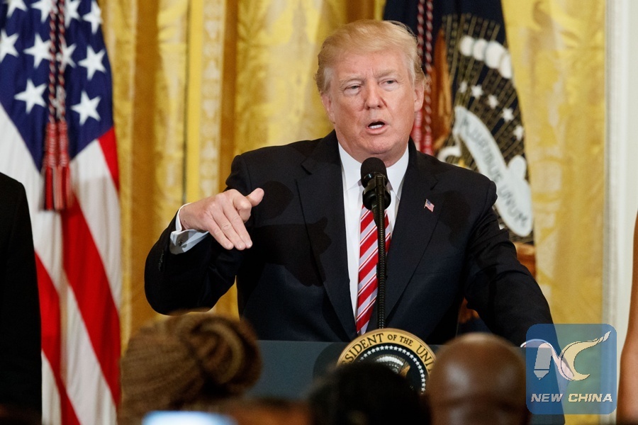 File Photo: U.S. President Donald Trump speaks during a National African American History Month reception at the White House in Washington D.C., the United States, Feb. 13, 2018. (Xinhua/Ting Shen)