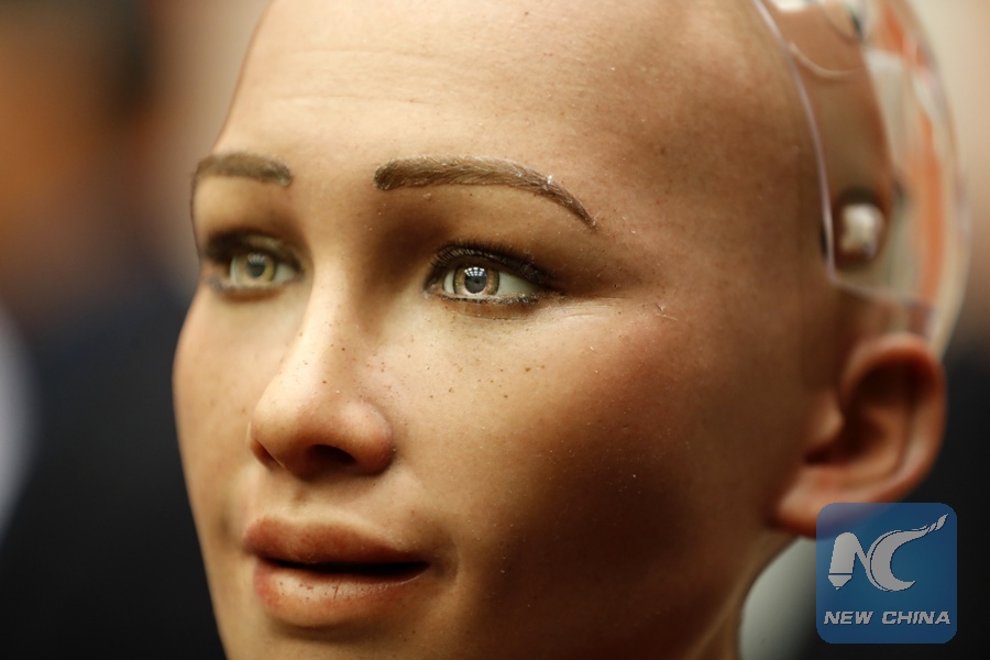 Sophia, a life-like humanoid robot, is pictured at the UN headquarters in New York, Oct. 11, 2017. Sophia was here attending a meeting on "The Future of Everything - Sustainable Development in the Age of Rapid Technological Change". (Xinhua/Li Muzi)