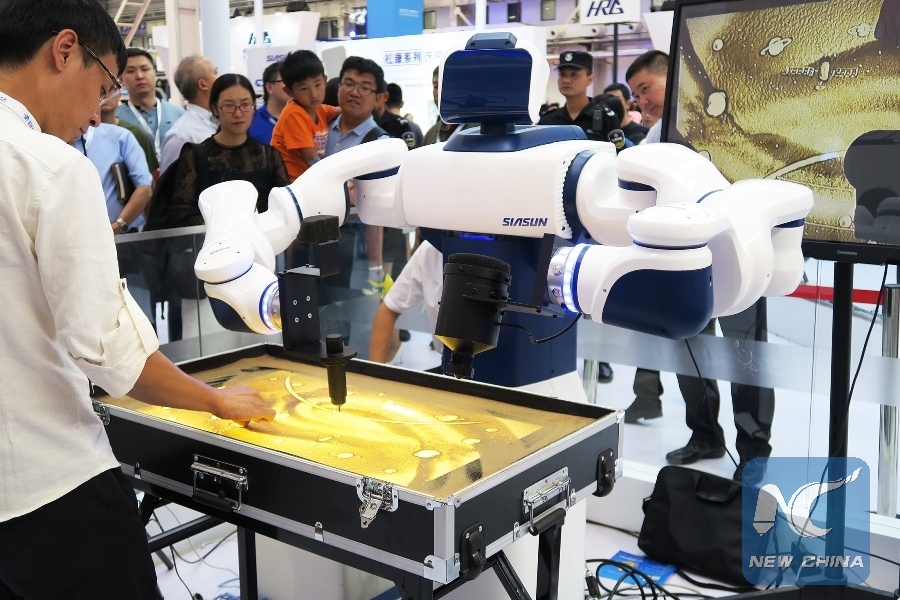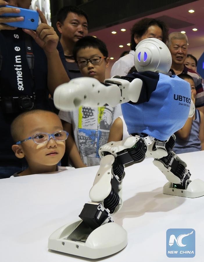 Visitors watch a robot dance at the World Robot Conference 2017 in Beijing, capital of China, Aug. 25, 2017. Over 300 artificial intelligent (AI) specialists and representatives of over 150 robot enterprises attended the conference. (Xinhua/Li Mingfang)