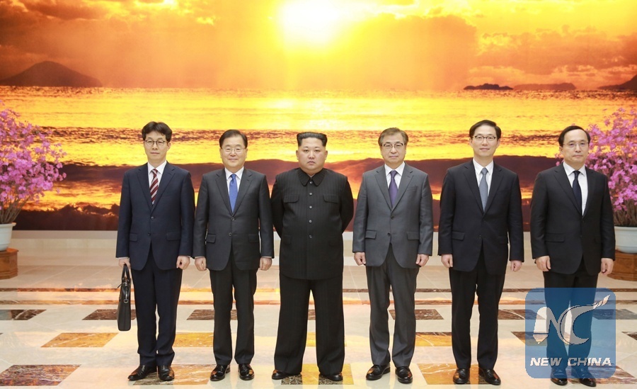 Photo provided by Korean Central News Agency (KCNA) on March 6, 2018 shows Kim Jong Un (3rd L), top leader of the Democratic People's Republic of Korea (DPRK), posing for a group photo with the members of South Korean delegation. (Xinhua/KCNA)