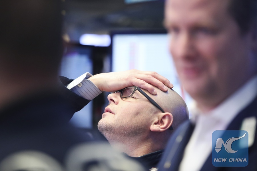 A trader has a rest after market closing at the New York Stock Exchange in New York, the United States, March 22, 2018. U.S. stocks ended lower on Thursday, with the Dow plunging over 700 points, after the U.S. President Donald Trump announced to impose tariff on imported products from China. (Xinhua/Wang Ying)