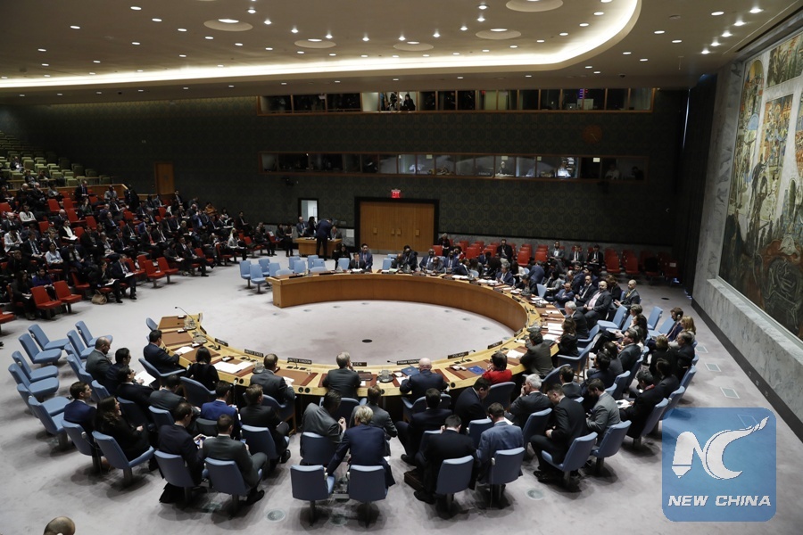 Photo taken on March 14, 2018 shows a general view of United Nations Security Council's meeting on the poisoning of a former Russian spy in Britain at the UN headquarters in New York. (Xinhua/Li Muzi)