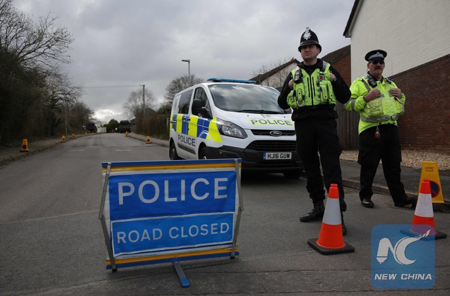 British police officers stand on duty as members of the Army work in a residential street in Alderholt, southern England, on March 15, 2018, as investigations and operations continue in connection with the major incident sparked after a man and a woman were apparently poisoned in a nerve agent attack in Salisbury on March 4. (Xinhua/AFP)