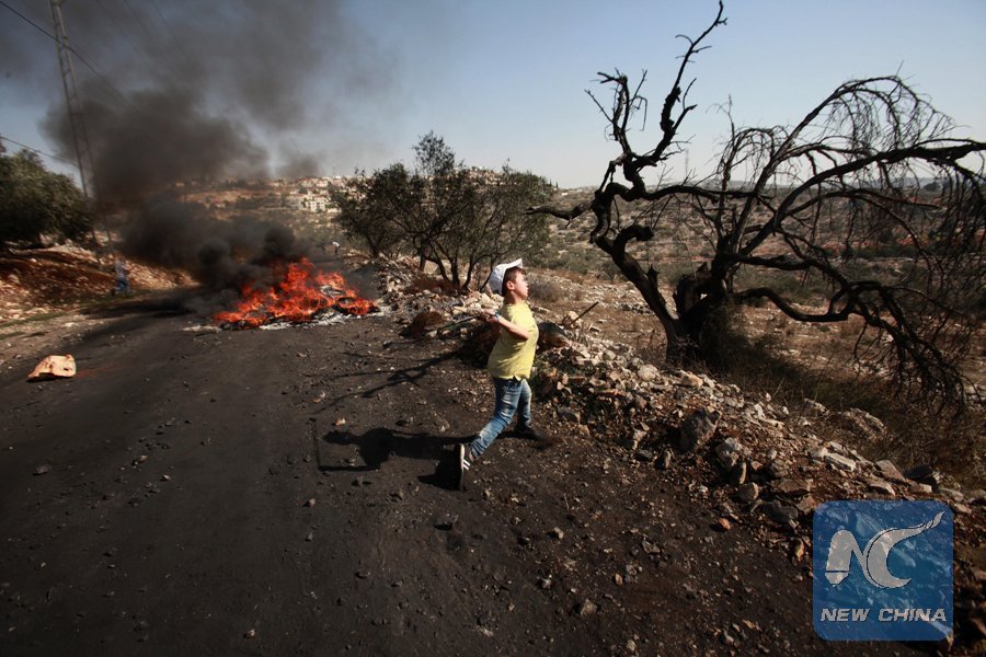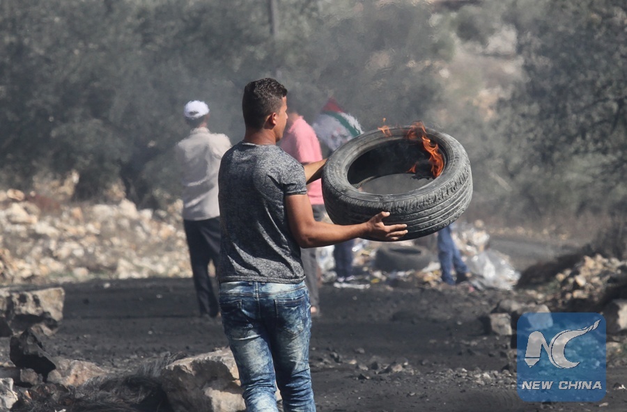 Clashes break out between Palestinian protesters and Israeli soldiers after a protest against the expanding of Jewish settlements in Kufr Qadoom village near the West Bank city of Nablus, on Oct. 27, 2017. (Xinhua/Nidal Eshtayeh)
