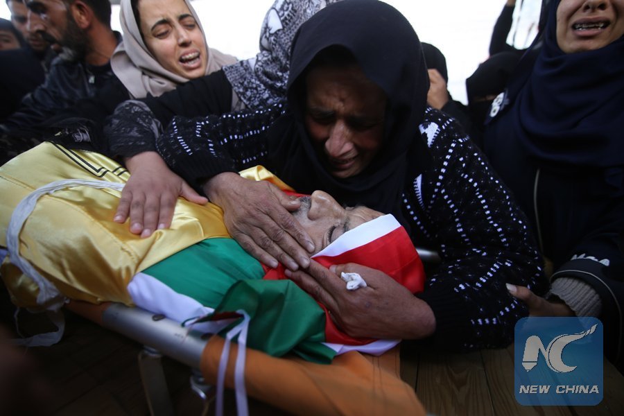 Relatives of Palestinian farmer Mohamed Abu Jame'a mourn over his body during his funeral in the southern Gaza Strip city of Khan Yunis, on March 4, 2018. Palestinian farmer Mohamed Abu Jame'a was killed by Israeli troops' gunfire when he approached his farm close to the borderline area between southern Gaza Strip city of Khan Younis and Israel, medics said. (Xinhua/Khaled Omar)
