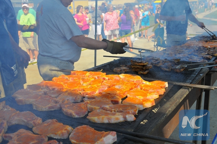 File Photo: People take part in the Annual Pork Festival in Kouts, Indiana, the United States, Aug. 25, 2012, during which there are all kinds of activities like parade, Porkburge Eating Contest, guessing the weight of a pig and Truck show. (Xinhua/Jiang Xintong)