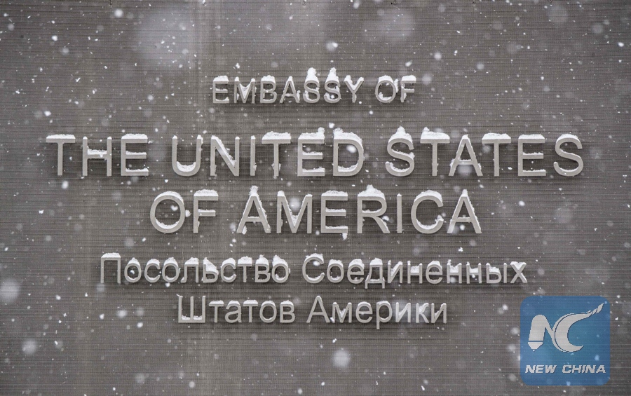 Photo taken on March 27, 2018 shows the sign outside the United States embassy in Moscow. (Xinhua/AFP)
