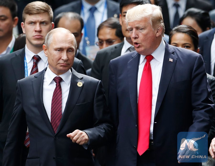 In this file photo taken on Nov. 11, 2017, U.S. President Donald Trump (R) and Russian President Vladimir Putin talk as they make their way to take the "family photo" during the Asia-Pacific Economic Cooperation (APEC) leaders' summit in the central Vietnamese city of Danang. (Xinhua/AFP)