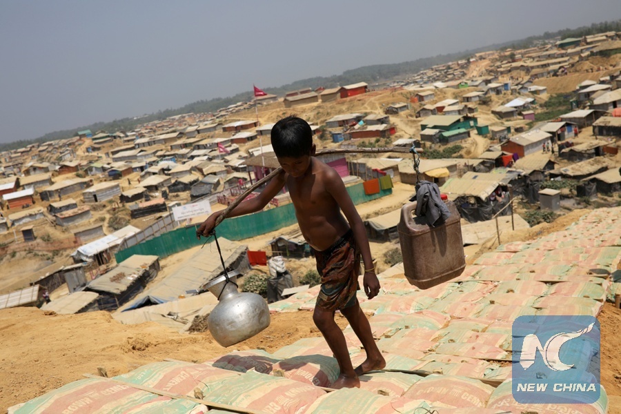 A Rohingya refugee boy carries water in the Kutupalong refugee camp, in Cox's Bazar, Bangladesh, March 22, 2018. (Xinhua/REUTERS)