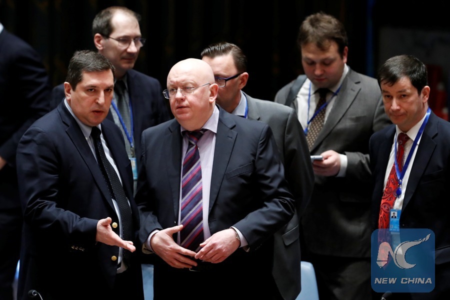 Russian Ambassador to the United Nations Vassily Nebenzia (C, front) is seen prior to a Security Council meeting on the chemical weapons use in Syria, at the UN headquarters in New York, on April 10, 2018. (Xinhua/Li Muzi)