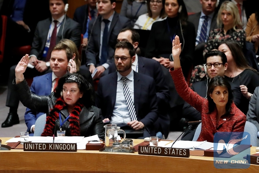 U.S. Ambassador to the United Nations Nikki Haley (R, Front) and British Ambassador to the UN Karen Pierce (L, Front) vote in favor of a U.S.-drafted resolution on probe of chemical weapons use in Syria at the UN headquarters in New York, on April 10, 2018. (Xinhua/Li Muzi)