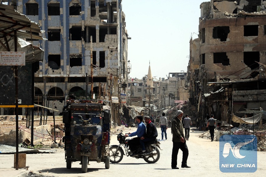 Syrians are seen in a street in Douma district, east of Damascus, Syria, on April 18, 2018. (Xinhua/Ammar Safarjalani)