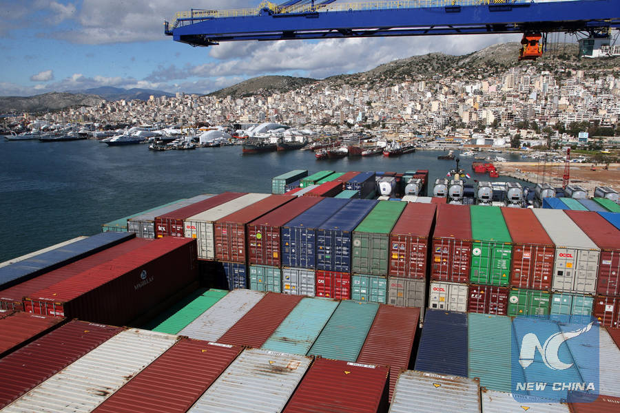 Containers on China's COSCO Shipping Taurus are seen at Piraeus port, Greece, on Feb. 26, 2018. (Xinhua/Marios Lolos)