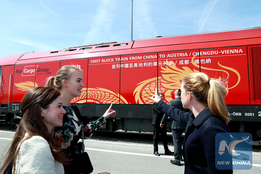 People look at a new China-Europe freight train from Chengdu to Vienna at the Vienna South Freight Center in Vienna, Austria, on April 27, 2018. (Xinhua/Pan Xu)