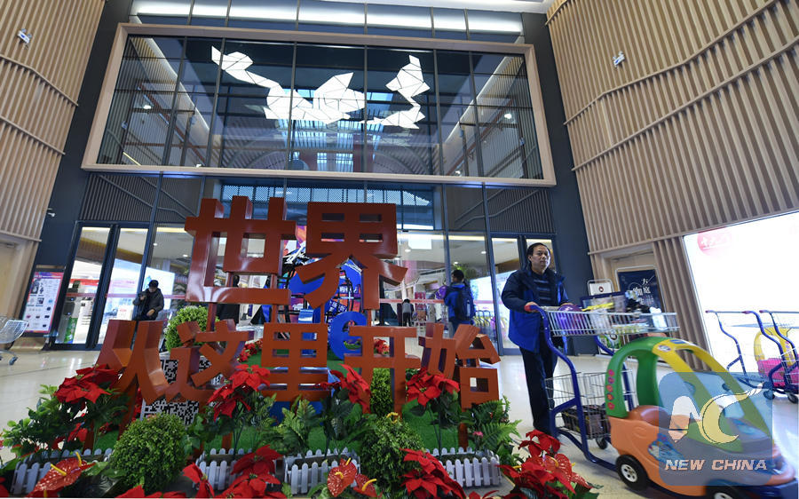 People shop at a bonded commodity shopping center in Zhengzhou City, capital of central China's Henan Province, on Dec. 8, 2017. The Belt and Road Initiative has made the inland Henan Province an emerging frontier of international trade. (Xinhua/Li Jianan)