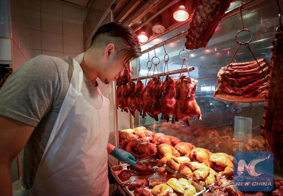 Anson Leung works at the HK BBQ Master restaurant in Richmond, Canada, June 28, 2018. (Xinhua/Liang Sen)