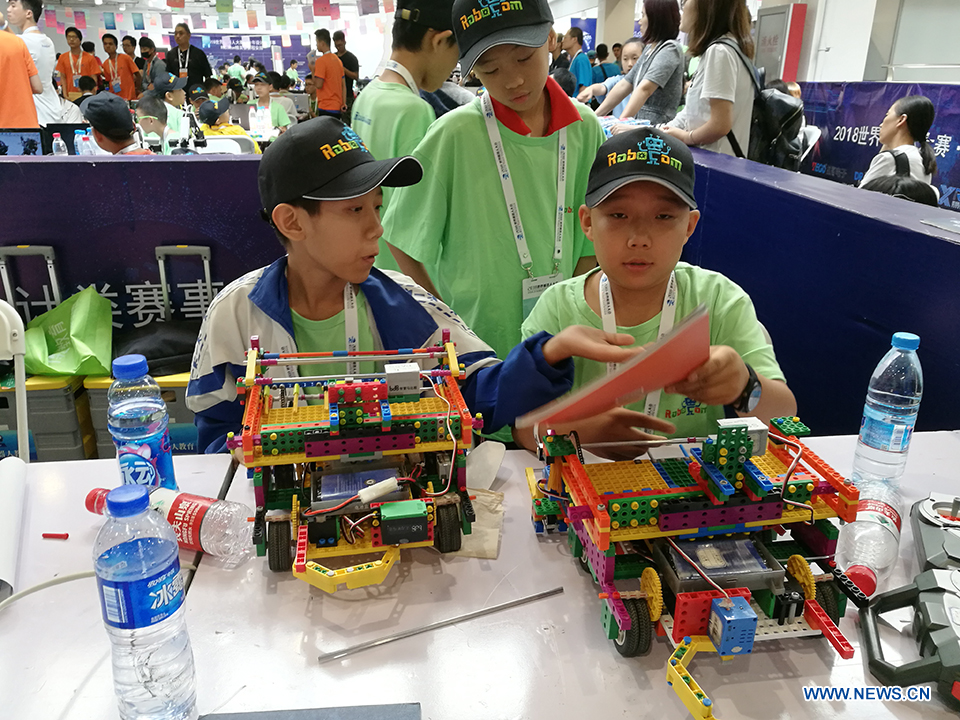 Participants prepare for a contest at the 2018 World Robot Conference in Beijing, Aug. 17, 2018. The conference attracts a total of 166 domestic and international enterprises exhibiting their cutting edge technologies and more than 500 items are displayed at the scene. (Xinhuanet/Yang Pengzhan)