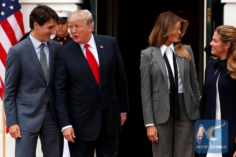 File Photo: U.S. President Donald Trump and first lady Melania Trump welcome Canada's Prime Minister Justin Trudeau and his wife Sophie Gregoire Trudeau on the South Lawn before the leaders' meeting about the NAFTA trade agreement at the White House in Washington, U.S. Oct. 11, 2017. (Xinhua/REUTERS)