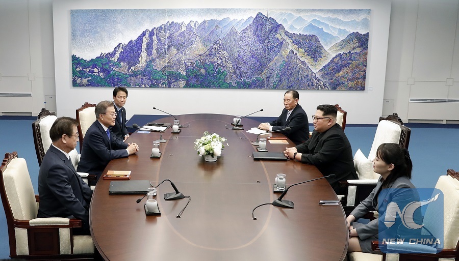 In this file photo taken on April 27, 2018, South Korean President Moon Jae-in (2nd L) meets with top leader of the Democratic People's Republic of Korea (DPRK) Kim Jong Un (2nd R) at the Peace House, a building on the South Korean side of Panmunjom. (Xinhua/Inter-Korean Summit Press Corps)