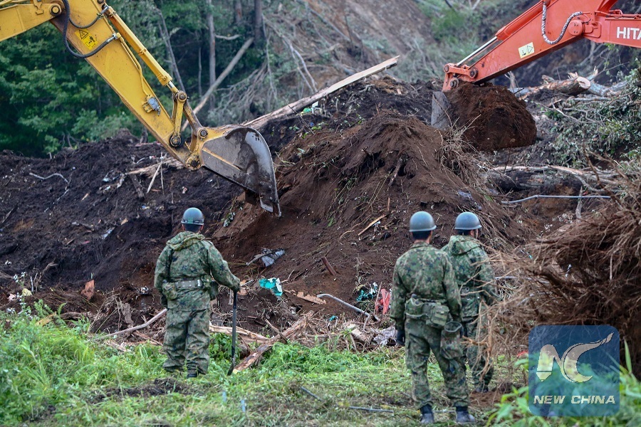 Rescue members operate excavators at a site of landslide due to earthquake in the town of Atsuma, Hokkaido prefecture, Japan, on Sept. 7, 2018. (Xinhua/Ma Caoran)