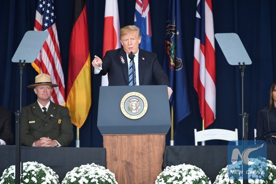 U.S. President Donald Trump speaks during a ceremony held at the Flight 93 National Memorial, marking the 17th anniversary of the Sept. 11 attacks, in Shanksville, Pennsylvania, the United States, Sept 11, 2018. (Xinhua/Yang Chenglin)