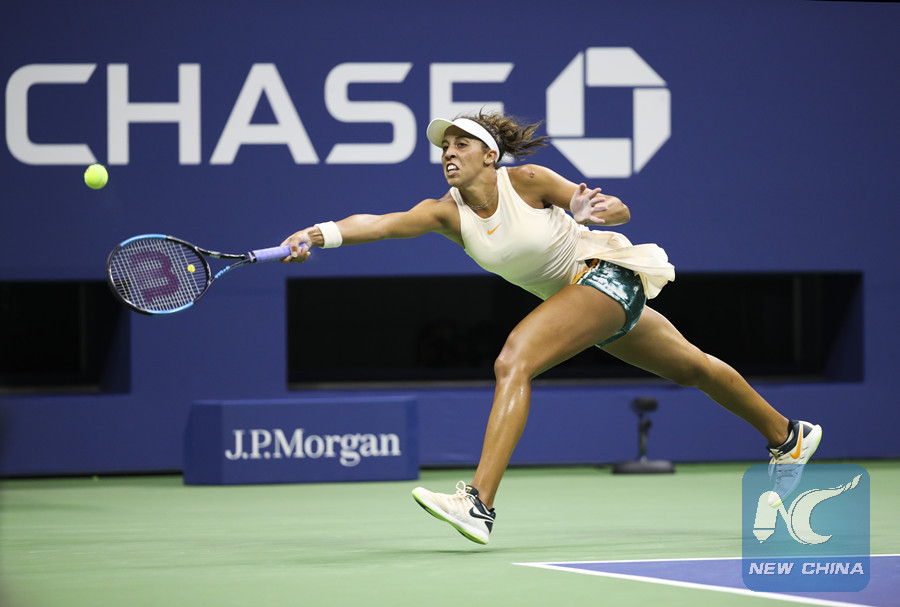 Madison Keys of the United States hits a return during the women's singles semi-final match against Naomi Osaka of Japan, at the 2018 US Open in New York, the United States, Sept. 6, 2018. Madison Keys lost 0-2. (Xinhua/Wang Ying)