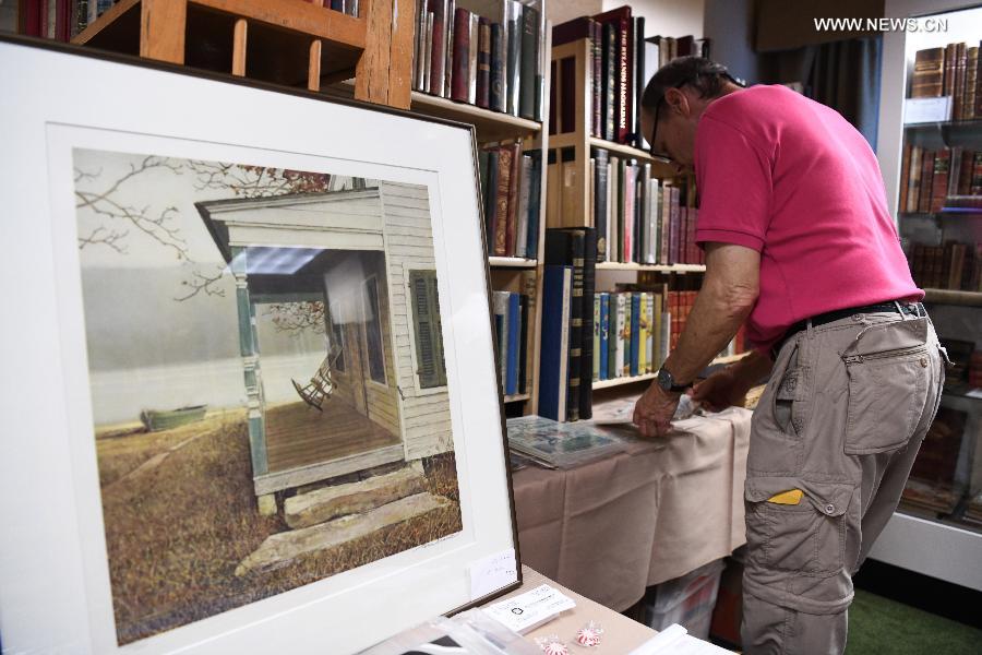 A man looks at antiquarian books at the Washington Antiquarian Book Fair in Arlington County, Virginia, the United States, on Sept. 28, 2018. Washington Antiquarian Book Fair is a festival of rare and collectible books, manuscripts, autographs, maps and drawings. (Xinhua/Liu Jie)