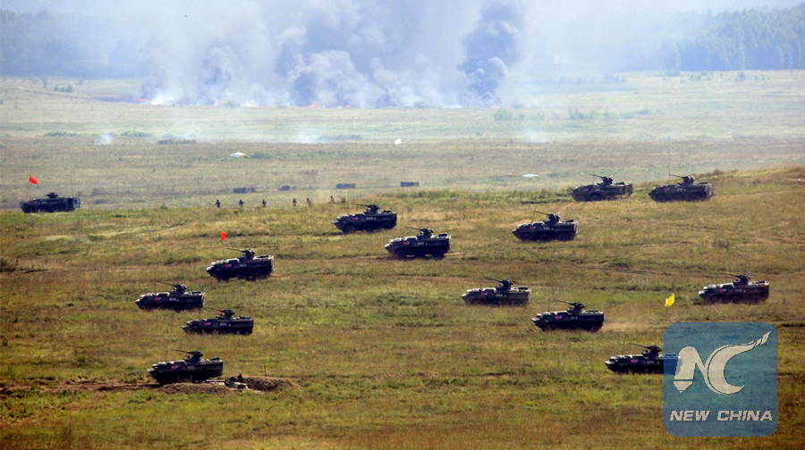 Chinese armored vehicles move forwards the target during the "Peace Mission 2007" anti-terror drill involving member states of the Shanghai Cooperation Organization (SCO) in Chelyabinsk of Russia, Aug. 17, 2007. (Xinhua/Li Gang)