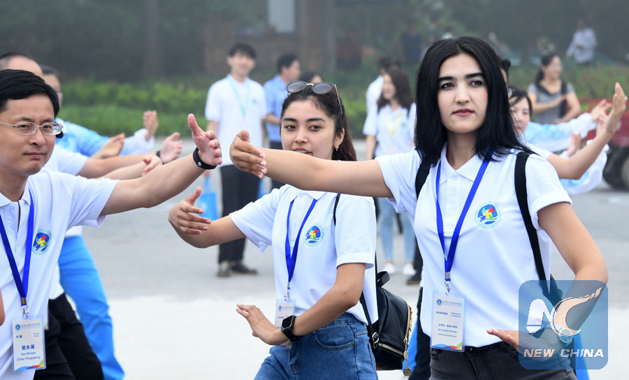 Fatima Kuchkarova from Uzbekistan (1st R) learns Taichi at Taiqing Temple in Qingdao, east China's Shandong Province, July 17, 2018. (Xinhua/Li Ziheng)