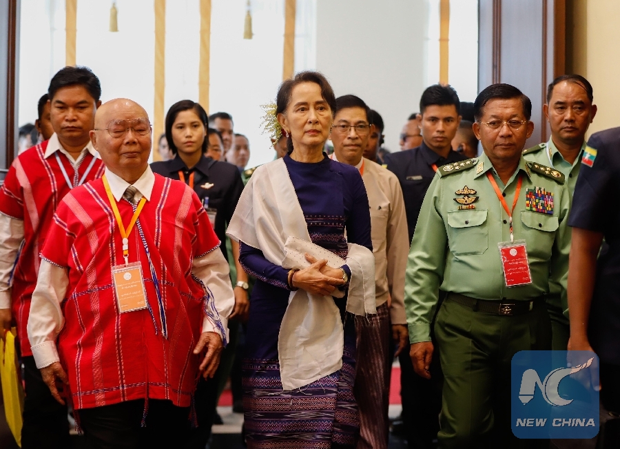 File Photo: This handout picture released by Myanmar State Counselor Office shows Myanmar's State Counselor Aung San Suu Kyi (C) arriving to attend a meeting in Nay Pyi Taw, Myanmar, Oct. 15, 2018. Myanmar's State Counselor Aung San Suu Kyi called for joint efforts to overcome difficulties and challenges in implementing the nationwide ceasefire accord (NCA) between the government and the NCA-signatory ethnic armed organizations (EAOs) through discussion and negotiation. (Xinhua/Myanmar State Counsellor Office)