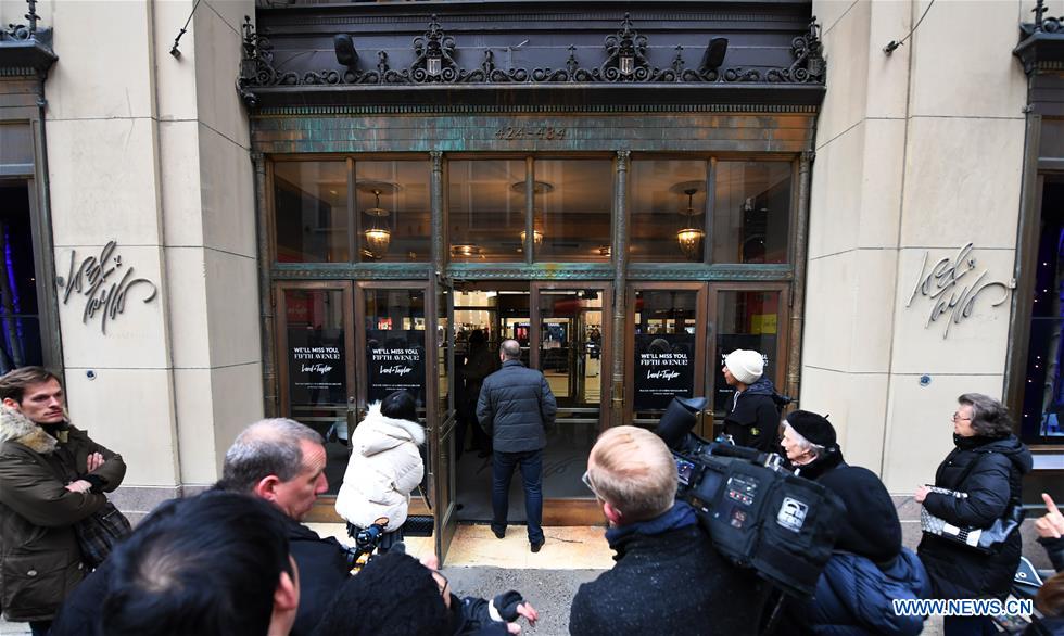 Journalists gather at the gate of the flagship store of the famous department store chain Lord & Taylor on Fifth avenue in Manhattan, New York, the United States, Jan. 2, 2019. The famous department store chain Lord & Taylor officially closed its flagship store on Fifth avenue in Manhattan, New York City. (Xinhua/Li Rui)