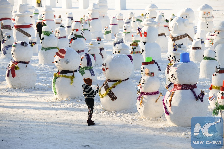 A woman takes photos of snowman sculptures on the riverbank of Songhua River in Harbin, capital of northeast China's Heilongjiang Province, Jan. 2, 2019. Altogether 2,019 cute snowmen were displayed here to greet the year 2019. (Xinhua/Wang Song) XINHUA PHOTOS OF THE DAY