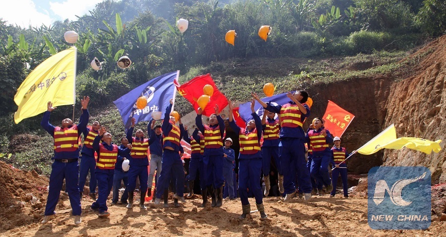 Workers from ChinaRailway No. 5 Engineering Group (CREC 5) celebrate the completing of the first over-1000-meter tunnel along the China-Laos railway in Luang Namtha province, Laos, on Oct. 28, 2018. (Xinhua/China Railway No. 5 Engineering Group)