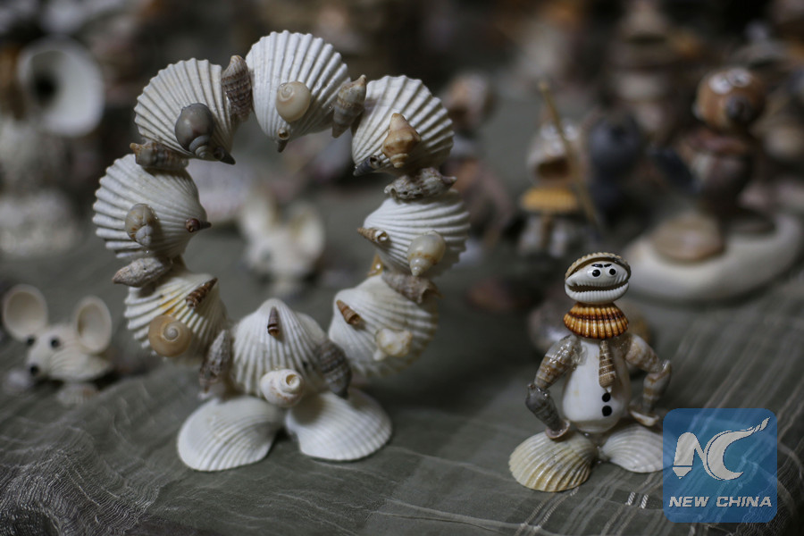 Art pieces made by Palestinian young man Ahmed al-Madhoun, 31, by using seashells he collects from Gaza beaches, are seen at his house in Gaza City, on Feb. 10, 2019. (Xinhua/Stringer)