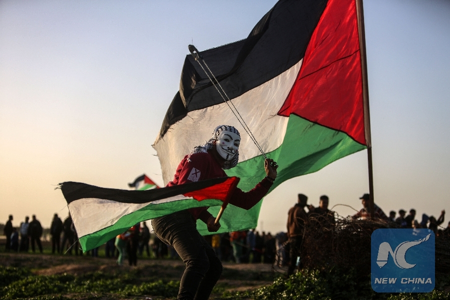 File Photo: A Palestinian protester uses a slingshot to hurl stones at Israeli troops during clashes on the Gaza-Israel border during clashes on the Gaza-Israel border, east of Gaza City, on Jan. 25, 2019. (Xinhua)