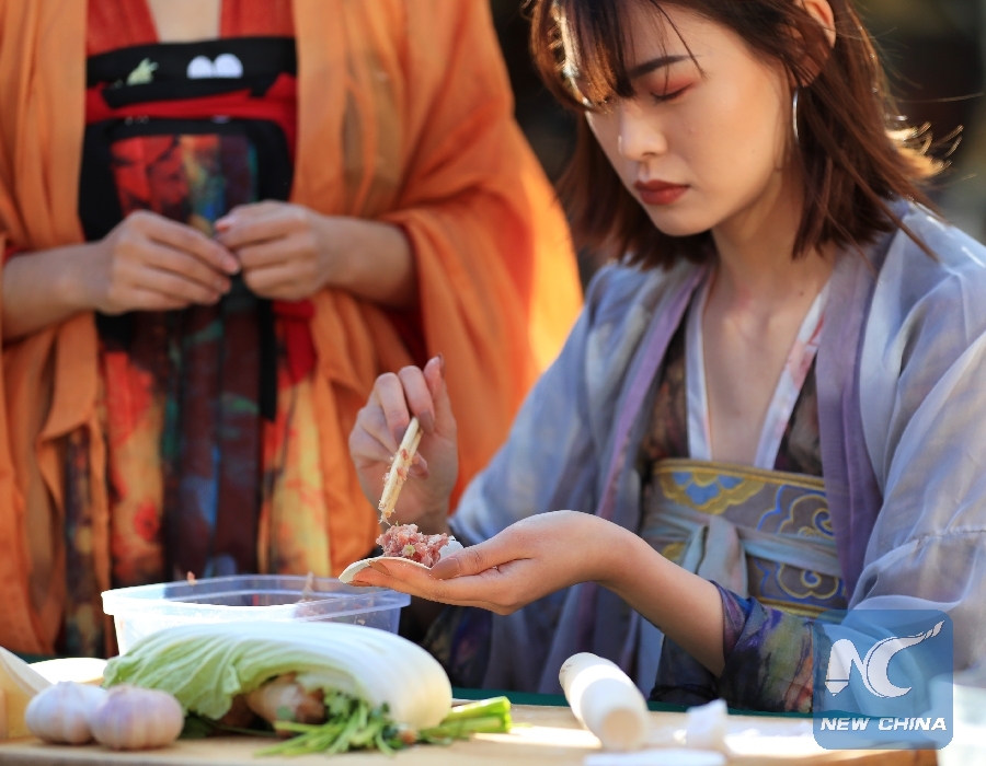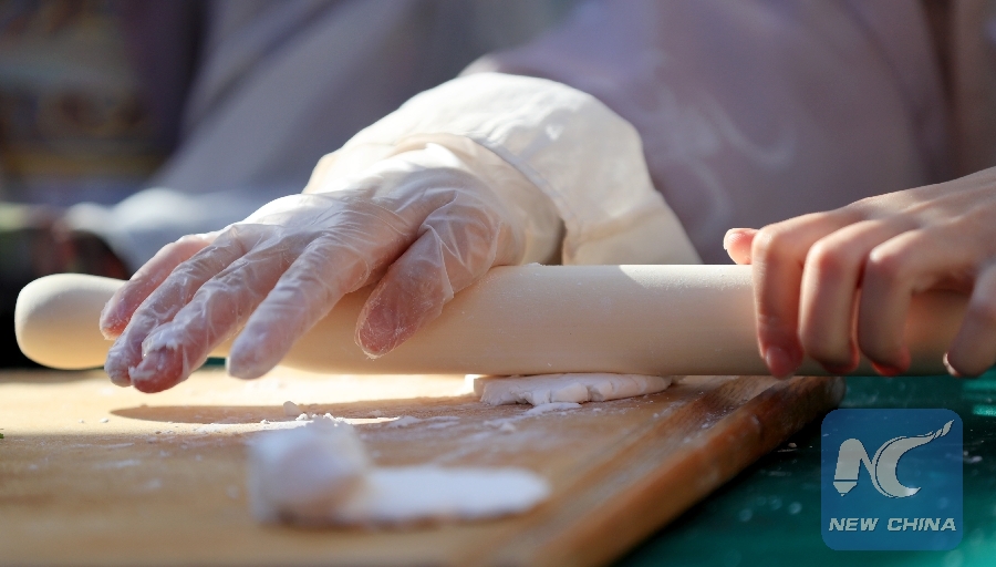A staff member demonstrates dumpling-making during a celebration of Chinese Lunar New Year at the Original Farmers Market in Los Angeles, the United States, Feb. 17, 2019. (Xinhua/Li Ying)