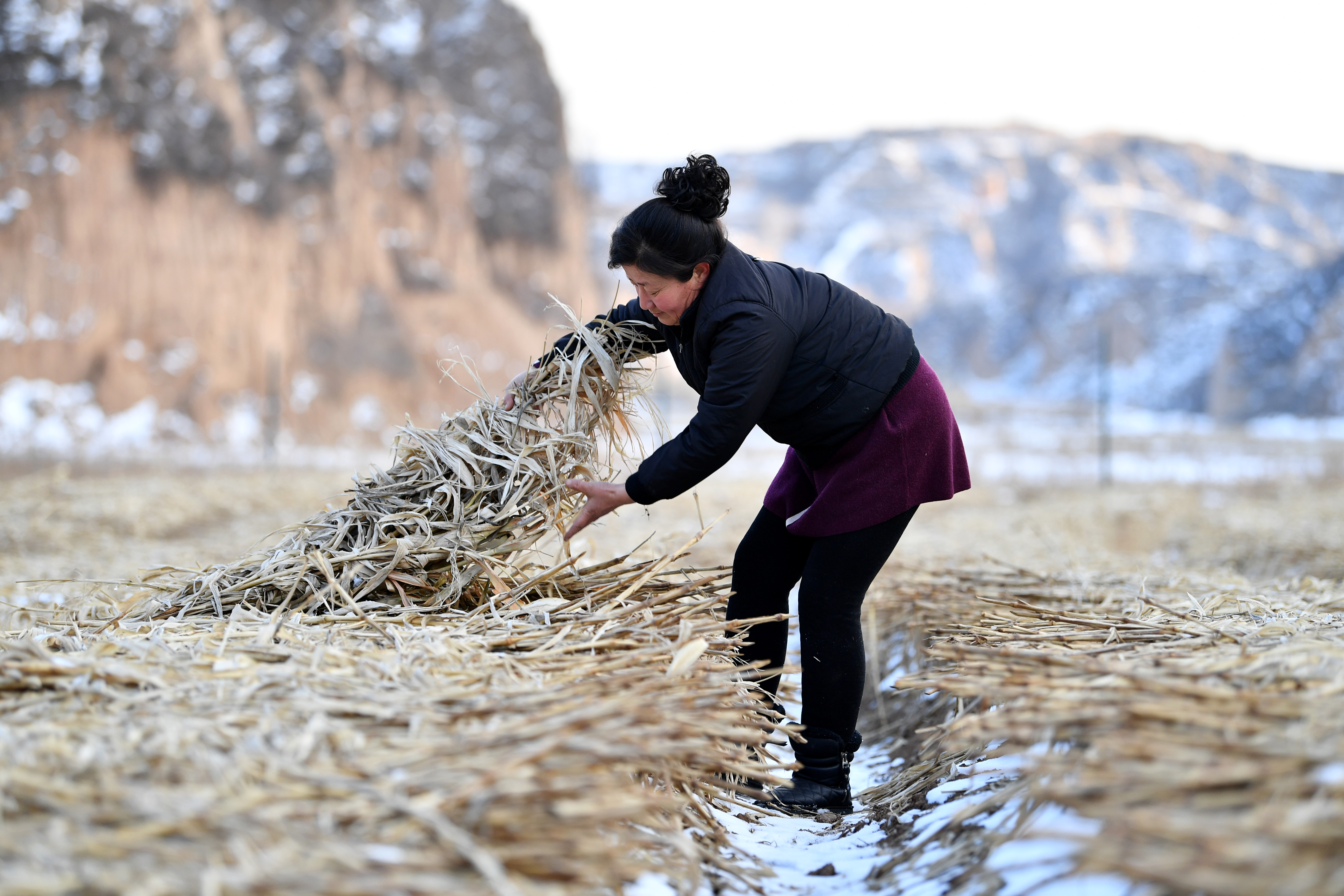 Villager Ma Shaihong checks the growing situation of black fungus in Wangzhuanggou Village, Wuxiang County of north China's Shanxi Province, Feb. 15, 2019. (Xinhua/Zhan Yan)