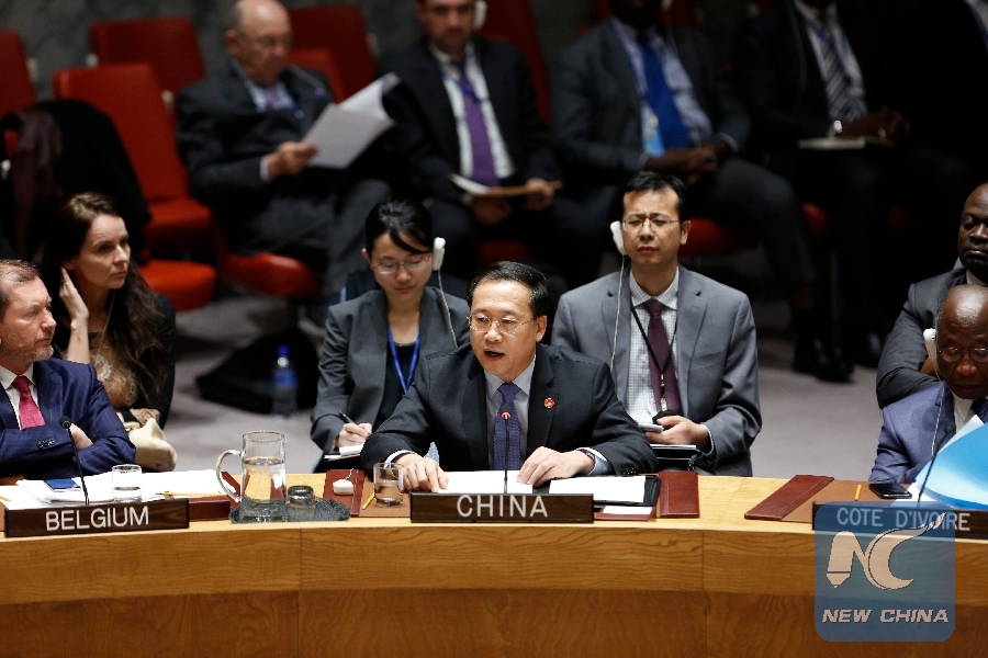 China's Permanent Representative to the United Nations Ma Zhaoxu (C, Front) addresses a United Nations Security Council meeting on the situation in Venezuela at the UN headquarters in New York, on Feb. 26, 2019. (Xinhua/Li Muzi)