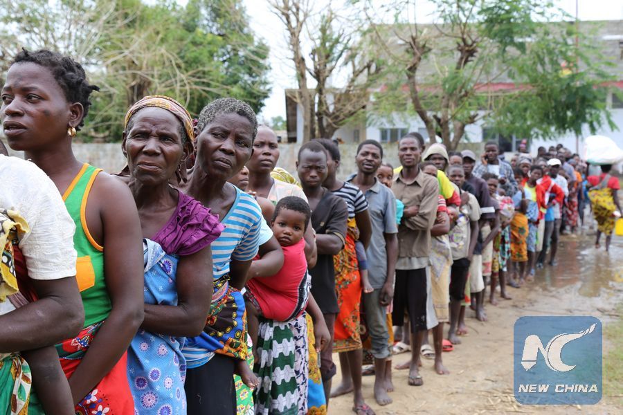 Local people queue to receive relief supplies in Tica town, along the National Road No. 6 (EN6) in the Pungue River Basin in Mozambique, March 23, 2019. (Xinhua/Nie Zuguo)