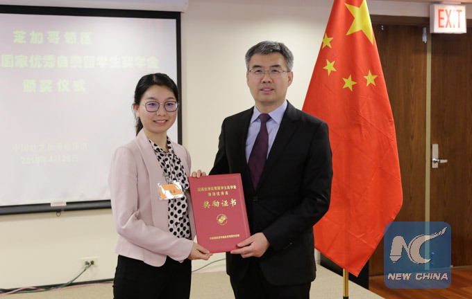 CHICAGO, April 28 (Xinhua) -- Twenty-nine Chinese students studying in the U.S. Midwest have received "2018 national awards for outstanding self-financed students abroad," which were delivered on Sunday by Chinese Consul General in Chicago Zhao Jian.