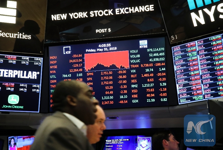Electronic screens show trading information at the New York Stock Exchange in New York, the United States, on May 31, 2019. (Xinhua/Wang Ying)