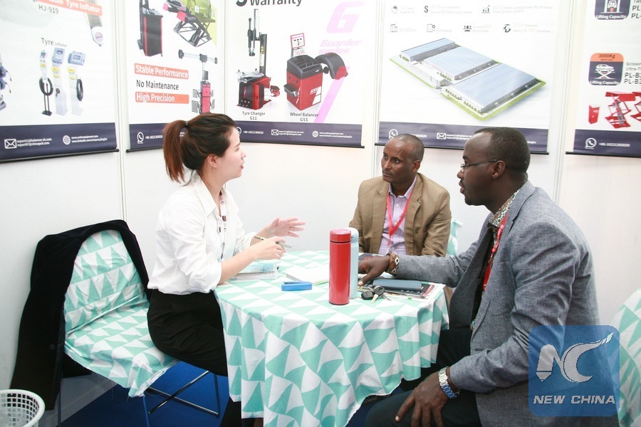 A trader (L) converses with customers during the 5th Edition of China Trade Week at Kenyatta International Convention Center (KICC) in Nairobi, capital of Kenya, June 7, 2019. (Xinhua/Charles Onyango)